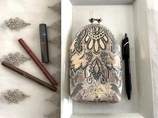 縦長タイプのがま口ポーチ。ペンや長めのメイク道具などに。